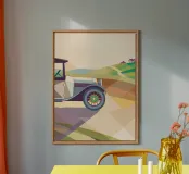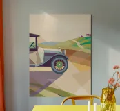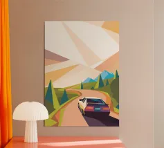 Holen Sie sich eine Illustration eines Oldtimers, der in der Landschaft fährt, in einem einzigartigen geometrischen Stil.
