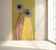 Eine abstrakte Illustration von zwei stilisierten Figuren, die kühn gemusterte rote und grüne Kleidung tragen, deren Formen vereinfacht und elegant sind.