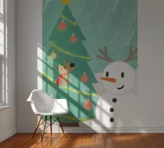Eine verspielte, weihnachtliche Illustration im Aquarellstil mit liebevollen Motiven wie Schneemann, Schlittschuhen, Tassen mit heißem Kakao, Zuckerstangen, Lebkuchenherzen und Tannen. Goldene Sternfunken und Schneeflocken verteilen sich locker über den hellen Hintergrund und verleihen der Szene eine warme, gemütliche Winter- und Weihnachtsstimmung.