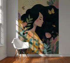 A portrait of a woman with flowing red hair, surrounded by stylized leaves and flowers, looking thoughtfully to the side. The style is modern, bold, and slightly art nouveau.