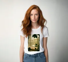 "Das Sonnenlicht strömt durch die Baumkronen des Waldes und malt goldene Muster auf den Waldboden, wo Vögel singen und die Blätter sanft im Wind rascheln.