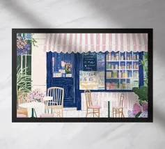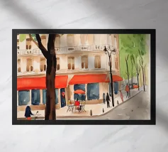 Minimalistisches Design eines typisch französischen kleinen Eck-Café's mit kleinen runden Tischen, roter Markise und süßer Tischpflanze. Dekoratives Design für alle, die leckere Kaffees in schönen Cafés mögen.