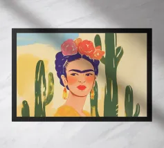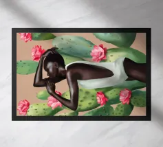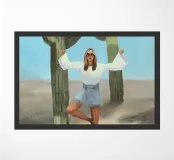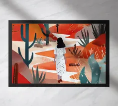 A bold, modern portrait of a confident woman striking a powerful pose in a sun-drenched desert, framed by towering cacti under a brilliant blue sky. This digitally painted artwork blends fashion, nature, and attitude, celebrating resilience and free-spirited strength. Ideal for Southwestern interiors, empowerment-themed decor, or as a striking gift for fierce, adventurous souls.