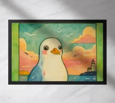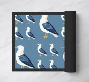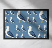 Das Bild zeigt eine minimalistische Möwenillustration mit klarem, grafischem Stil. Die Möwe hat einen weißen Körper, blaue Flügel mit weißen Akzenten sowie einen gelben Schnabel und gelbe Beine. Der Hintergrund ist blau, was einen schönen Kontrast zur weißen Möwe schafft. Der Stil ist schlicht, modern und dekorativ, mit einer reduzierten Farbpalette und klaren Linien – fast wie ein stilisiertes Logo oder eine moderne Wandkunst. Ein schönes Beispiel für grafische Designkunst!