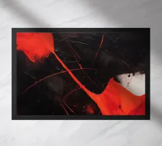 Ein dynamisches abstraktes digitales Gemälde mit scharfkantigen geometrischen Formen in leuchtenden Rot-, Orange- und Gelbtönen vor einem tief burgunderroten und schwarzen Hintergrund. Das Design evoziert Wärme, Energie und Kontrast durch intensive Farben und kantige Fragmentierung.