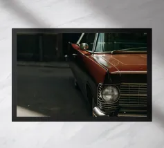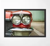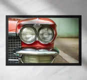 Die Vorderseite dieses klassischen roten Autos besticht durch seine atemberaubenden Details. Die ikonische leuchtend rote Farbe, kombiniert mit dem perfekten Design.