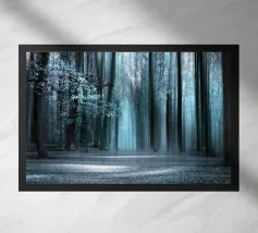 Abstrakte Waldlandschaft mit vertikalen Lichtstreifen. Sanfte Grüntöne und Bewegungsunschärfe verleihen dem Motiv eine ruhige, fast meditative Atmosphäre und erinnern an einen Spaziergang durch einen lichtdurchfluteten Wald