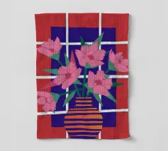 Ein fröhliches Stillleben mit einem Strauß roter Mohnblumen in einer Terrakotta-Vase vor einem heiteren, patchworkartigen Hintergrund aus gelben und blauen Fliesen.