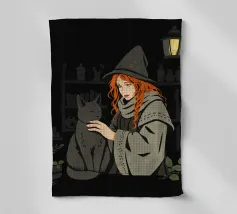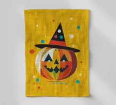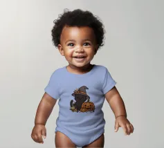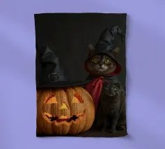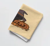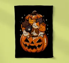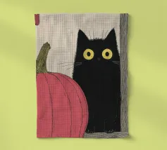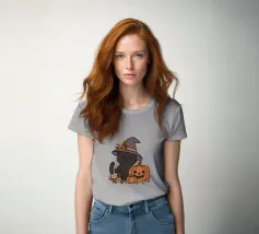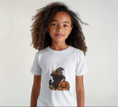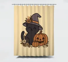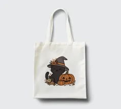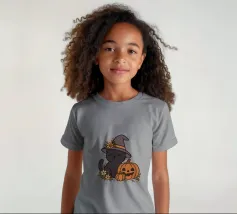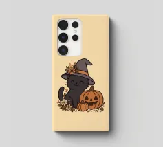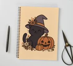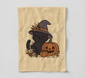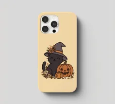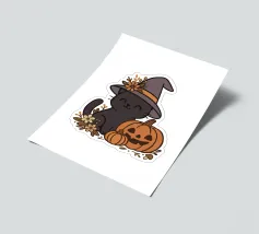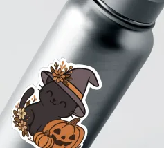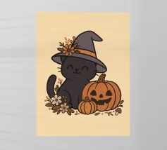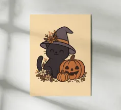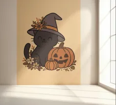 Liebenswerte schwarze Katze mit einem Hexenhut, umgeben von Kürbissen, Pilzen und Herbstblumen in warmen Gelb- und Brauntönen. Perfektes kawaii Halloween-Design für Aufkleber, T-Shirts, Tragetaschen und gemütliche saisonale Geschenke. Feiern Sie die gruselige Herbstsaison mit einer charmanten und niedlichen Illustration!