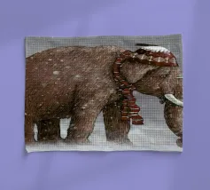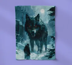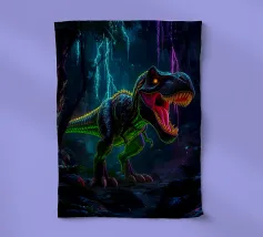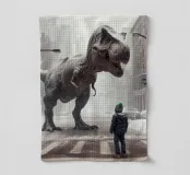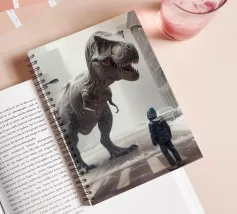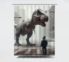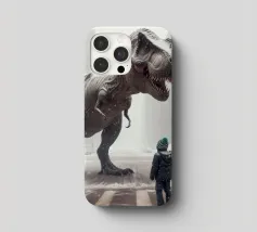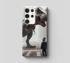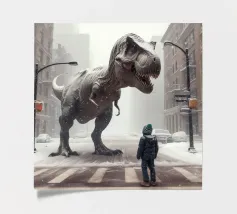 Ein riesiger T-Rex überragt ein kleines Kind in einer winterlichen Stadtlandschaft, umgeben von schneebedeckten Straßen und hohen Gebäuden. Die surreale Begegnung stellt prähistorische Kraft und moderne Stadtlandschaft einander gegenüber.