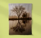 The water below mirrors the tree perfectly, capturing every leaf and curve in a soft, shimmering reflection. The surface is calm, like glass, blurring the line between reality and its mirrored twin. As light shifts gently across the scene, the reflection seems to move with it — a quiet dance of nature and water, beauty and balance