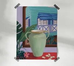 Die strenge Geometrie eines überdachten Gehwegs wird durch kühne karminrote Säulen und die langen, scharfen Schatten, die sie im hellen Sonnenlicht werfen, bestimmt. Dieses Gemälde ist eine kraftvolle Studie von Licht, Schatten, Farbe und architektonischer Form.