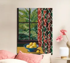 Ein sanftes und heiteres Stillleben einer Schale mit Zitronen auf einer gemusterten Oberfläche, mit fließenden grünen Blättern im Hintergrund, das in einer sanften, pastellartigen Palette wiedergegeben ist.