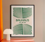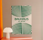 Ein raffiniertes und hypnotisierendes Kunstwerk! Dieses abstrakte Poster, das von der Dynamik der Bauhaus-Bewegung inspiriert ist, verwendet geschwungene Linien und geschwungene Streifenmuster, um einen auffälligen optischen Effekt und ein Gefühl der fließenden Bewegung zu erzeugen. Das Design ist in einem tiefen, luxuriösen Smaragdgrün vor einem cremefarbenen Hintergrund gehalten. Dieser satte Farbton hebt den geometrischen Fluss hervor und macht es zu einem atemberaubenden Herzstück für luxuriöse, minimalistische oder klassische Interieurs der Jahrhundertmitte. Dies ist ein erstklassiger digitaler Download von hervorragender Qualität, der mit einer ultrahohen Auflösung von 7000x5000 Pixeln und 300 dpi geliefert wird. Dies garantiert
