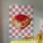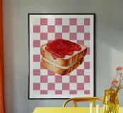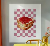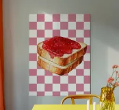 Ein Stapel von drei Toastbrotscheiben mit einer großzügigen Schicht leuchtend roter Marmelade auf der Oberseite befindet sich vor einem rosa und weiß karierten Hintergrund. Die realistische Darstellung des Brotes kontrastiert mit dem verspielten, geometrischen Hintergrund.