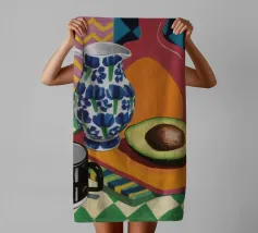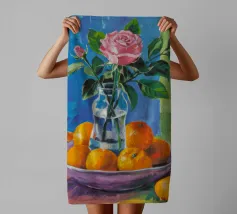 Ein Stillleben mit Zitronen in einer blauen Schale, die auf einem reichhaltigen violetten Tuch ruht. Dahinter steht eine hohe gelbe Vase mit weißen Zweigen vor einem feurig orangefarbenen Hintergrund, der eine kontrastreiche, farbenfrohe Szene erzeugt.