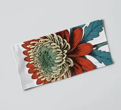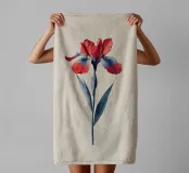 Eine wunderschön detaillierte Illustration einer roten und blauen Irisblüte auf hellem Hintergrund, mit leuchtenden Blütenblättern und weichen, natürlichen Farbverläufen. Der anmutige Stiel und die Blätter verstärken den künstlerischen Reiz.