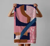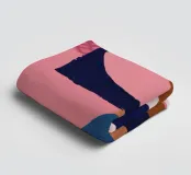 A bold and modern abstract composition features a dynamic arrangement of overlapping shapes in pink, navy blue, and black, with textured details creating a sophisticated and graphic piece.