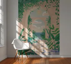 Ein bezaubernder Gartenweg oder eine Allee, in der üppiges grünes Laub und Kletterpflanzen einen natürlichen Torbogen bilden. Das Sonnenlicht dringt durch die Blätter und erhellt den Weg, der zu einer hellen, einladenden Öffnung mit dekorativen Fliesen an den unteren Wänden führt.