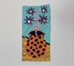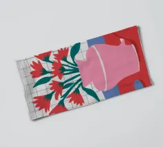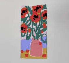 A joyful still life of a bouquet of red poppies in a terracotta vase, set against a cheerful, patchwork like background of yellow and blue tiles.