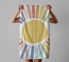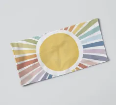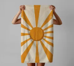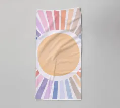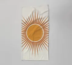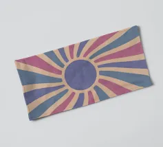 Strahlende Linien in erdigen Tönen wie Grün, Braun und Orange erstrecken sich von einem zentralen Kreis nach außen und erzeugen einen Sunburst-Effekt. Das Design weist eine Retro-Ästhetik mit symmetrischen Mustern und einer beruhigenden Farbpalette auf.