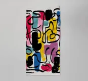 Eine kühne abstrakte Komposition aus dicken schwarzen gestischen Linien, die über lebhafte Farbblöcke gelegt sind. Sattes Rot, elektrisches Blau, sonniges Gelb, zartes Rosa und gedämpftes Blaugrün interagieren innerhalb eines locker definierten Rasters und schaffen eine dynamische Spannung zwischen Struktur und Spontaneität. Die schweren, strukturierten Linien stehen im Kontrast zu den flachen, aber leicht verwitterten Farbfeldern und erzeugen Tiefe und Bewegung. Formen überlagern und unterbrechen sich gegenseitig und bilden einen visuellen Dialog zwischen Ordnung und Instinkt. Die Komposition schafft ein Gleichgewicht zwischen Kontrolle und rohem Ausdruck und führt zu einer kraftvollen Studie über Rhythmus, Kontrast und
