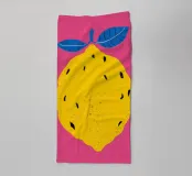 Eine große, einzelne gelbe Zitrone, illustriert mit einem strukturierten, düsteren Stil vor einem leuchtend rosa Hintergrund. Das Werk ist eine kühne, moderne und grafische Pop-Art-Interpretation einer klassischen Frucht.