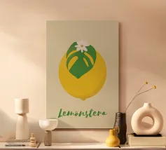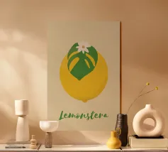 Bringen Sie Freude und Frische in Ihren Alltag mit unserer humorvollen und charmanten Illustration "Lemonstera". Dieses einzigartige Design kombiniert die Formen einer Limone und eines Monstera-Blattes zu einem originellen und kreativen Kunstwerk. Die Illustration nutzt eine sanfte Farbpalette aus Gelb- und Grüntönen, die eine fröhliche und lebendige Stimmung erzeugt. Der Hintergrund ist in einem weichen, gelblichen Beige gehalten, das die Details der Limone und des Blattes hervorhebt. Im Zentrum steht eine Limone, die mit einem detailliert gezeichneten Monstera-Blatt und einer kleinen weißen
