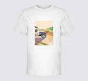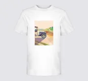 Holen Sie sich eine Illustration eines Oldtimers, der in der Landschaft fährt, in einem einzigartigen geometrischen Stil.