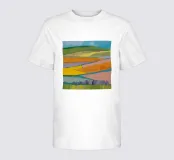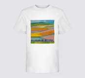 Ein malerischer Blick auf hügelige Patchwork-Felder, die in kräftigen Pastelltönen gehalten sind und eine traumhafte Landschaft schaffen.