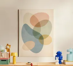 Dieses moderne Kunstwerk verbindet klare Formen mit sanften Farbverläufen in Apricot, Rosé und Petrolblau. Die reduzierte Komposition mit zwei halbkreisförmigen Flächen schafft Ruhe, Balance und stilvolle Ästhetik. Perfekt für moderne Interiors, skandinavische Einrichtungen und alle, die ruhige Wandkunst mit Farbakzent lieben.