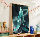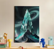 Eine surreale Darstellung des K2, verwandelt in ein hoch aufragendes kristallines Gebilde, das in einem unwirklichen blaugrünen Leuchten erstrahlt. Vor einem kosmischen Hintergrund aus wirbelnden Galaxien und Polarlichtern verschmilzt der Berg mit natürlichen und himmlischen Elementen und schafft eine visuelle Metapher für das Unendliche. Die eisigen Gipfel gehen nahtlos in die kristallinen Formen über, die die Erhabenheit des Berges einfangen und ihn zu einem Symbol der Transzendenz und des Geheimnisses werden lassen.