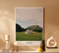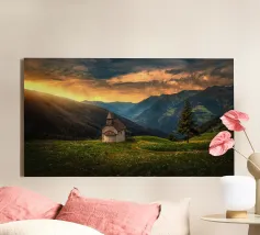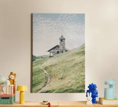 Surrounded by open meadows and swaying grass, it overlooks the valley below with quiet grace. The air is still, filled with the scent of wildflowers and the distant sound of birdsong. The chapel’s simple cross reaches toward the sky, a symbol of serenity and solitude."