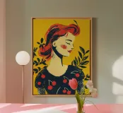 Dieses Poster ist eine nostalgische Hommage an den Mid-Century-Stil und die Illustrationen der 50er und 60er Jahre. Der Stil erinnert an die lebendige Ästhetik alter Magazin-Cover, kombiniert mit der einfachen Farbpalette des Siebdrucks. Die Farbkontraste aus leuchtendem Gelb, sattem Rot und tiefem Schwarz geben dem Bild eine kraftvolle Dynamik. Die Frau, dargestellt mit geschlossenen Augen und einem sanften Lächeln, strahlt eine ruhige Gelassenheit aus. Es ist ein Bild, das nicht nur eine Geschichte erzählt, sondern auch eine Atmosphäre von jugendlicher Fröhlichkeit in den Raum bringt.