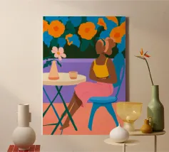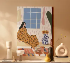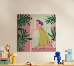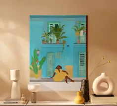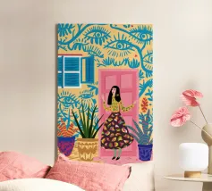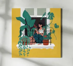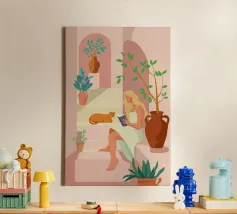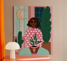 Eine ruhige Abendszene mit einer Frau und ihrer Katze, die bei offenen Türen sitzen, umgeben von üppigen Pflanzen und sanftem Mondlicht. Die sanfte Komposition wirkt verträumt und feminin mit klaren Linien und pastellfarbener Ruhe. Sie bringt ein wenig Ruhe und langsame Lebensenergie in Ihren Tag.