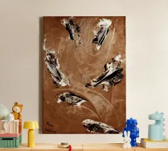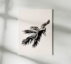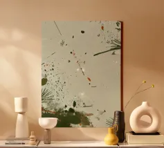 Sanft verwaschene Umbra- und Moosgrüntöne vermischen sich mit vereinzelten Spritzern und Pinselspuren, die an Tannennadeln und Waldluft erinnern. Die minimalen Zeichen und die tonale Zurückhaltung schaffen ein meditatives Gefühl von organischem Rhythmus und natürlicher Ruhe.
