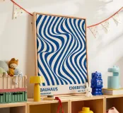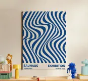 Bauhaus Wellenmuster – Abstrakte Kunst in Blau-Weiß Leinwand mit Schattenfugenrahmen
