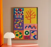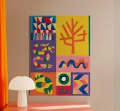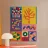 Ein farbenfrohes Gittermuster aus Quadraten, gefüllt mit verschiedenen abstrakten geometrischen und organischen Formen, darunter Schlangen und Pflanzen, in einer lebhaften, von der Volkskunst inspirierten Farbpalette.