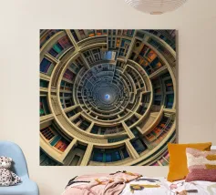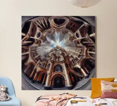 Dieses Bild zeigt eine komplizierte kreisförmige Architektur mit verschnörkelten Steinsäulen, einer zentralen Statue und einer Glasdecke. Die surreale Perspektive erzeugt einen tunnelförmigen Effekt, der das Auge auf das Zentrum der Komposition lenkt.