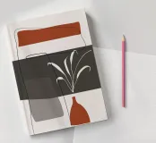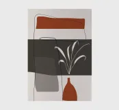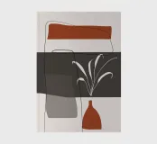 Abstrakte Linien und Blöcke in gedeckten Farben bilden eine moderne Komposition mit einer minimalistischen Ästhetik. Eine stilisierte Pflanzenform und eine einfache Vasenform fügen organische Elemente hinzu, die mit geometrischen Formen kontrastieren.