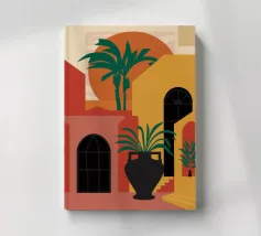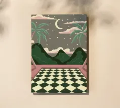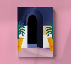 Ein eleganter und faszinierender Blick durch zwei gewölbte Türen, die in einen Raum mit einem kühnen schwarz-weiß karierten Boden führen, der von üppigen Pflanzen flankiert wird. Die Komposition schafft ein Gefühl von Tiefe und stilvollem Geheimnis.