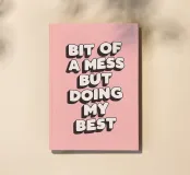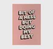 Bringen Sie einen Hauch von ehrlichem Charme in Ihren Raum mit diesem Kunstdruck "Bit of a Mess But Doing my Best", der einen fetten schwarzen und weißen handgezeichneten 3D-Schriftzug vor einem weichen Hex:fbbab2-Hintergrund zeigt. Das moderne Design zelebriert die Unvollkommenheiten des Lebens und macht es zu einem aufmerksamen Geschenk für Freunde, Familie oder jeden, der Ermutigung braucht. Dieser Druck eignet sich perfekt für Heimbüros, Schlafzimmer oder Kreativstudios und bringt Wärme und Persönlichkeit an jede Wand. Ideal für Geburtstage, Abschlussfeiern oder einfach nur so: Erkennen Sie die Schönheit, die darin liegt, jeden Tag aufs Neue sein Bestes zu geben.