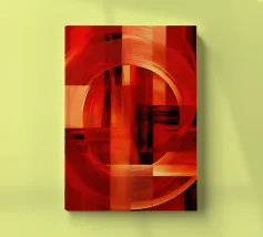 Ein fesselndes Kunstwerk mit lebhaften Rottönen, die sich mit leuchtenden Kreisen und wirbelnden Linien vermischen. Das abstrakte Design erweckt Gefühle von Bewegung und Intensität, perfekt für jeden modernen Raum.