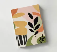 Stilisierte Blätter in Schwarz und Grün stehen vor einem Hintergrund aus fließenden, geschwungenen Streifen in sanften Erdtönen. Das Design kombiniert botanische Elemente mit abstrakten geometrischen Formen für einen modernen Look.