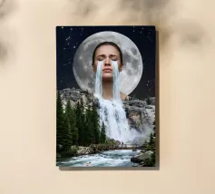Dieses eindrucksvolle, surreale Porträt verbindet menschliche Schönheit mit kosmischen Wundern. Eine Frau steht vor einem sternenübersäten Universum, umrahmt von einem leuchtenden goldenen Heiligenschein, der mit Planeten, Monden und fernen Galaxien verziert ist. Ihre leuchtend blauen Augen und ihr Vintage-Spitzenkleid verleihen ihr Eleganz, während die himmlischen Elemente ein Gefühl von Geheimnis, Erleuchtung und Fantasie vermitteln. Perfekt für Liebhaber von Fantasy-Kunst, Astrologie, Weltraumthemen und symbolischen Darstellungen, die innere Welten und die Weite des Kosmos erkunden.