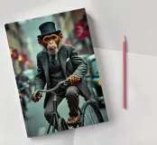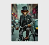 Affe auf Fahrrad mit Hochrad in viktorianischer Straße Ein charmanter Affe in einem dreiteiligen Anzug fährt auf einem alten Hochrad durch eine belebte viktorianische Straße. Die lebendigen Farben und scharfen Details erinnern an hyperrealistische Kunst.