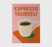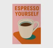 Espresso Yourself" ist eine charmante Mischung aus Wortspiel und Design und lädt dazu ein, sich durch Koffein und Farbe auszudrücken. Eine cremefarbene Kaffeetasse mit aquamarinfarbenen Akzenten sitzt auf einem kräftigen orangefarbenen Schatten, der sich vor einem zartrosa Hintergrund abhebt. Der Kontrast zwischen warmen und kühlen Tönen sowie die handgezeichneten Strukturen verleihen dem Bild einen verspielten und aufmunternden Charakter. Dieser Druck ist ideal für Küchen, Cafés oder kreative Ecken und bringt mit jedem Blick Persönlichkeit ins Spiel.