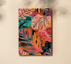 Eine moderne abstrakte Komposition aus geometrischen Formen und Farbblöcken in einer Palette von Gelb, Schwarz, Rosa und Orange. Der Stil ist ausgewogen und hat ein Retro-Gefühl.