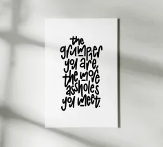 "The grumpier you are, the more a**holes you meet." – perfekt für alle Dauernörgler, "ständig mit-dem-falschen-Fuß" Aufsteher und selbsternannten Pechvögel. Damit kannst Du den täglichen Wahnsinn mit einem guten Spruch kontern! Ob auf Hoodie, Bürokaffeetasse oder als Poster – dieses Statement sorgt garantiert für Lacher (oder zumindest fürs Nachdenken). Also, tief durchatmen, lächeln und dem/der dauergrumpigen KollegIn den passenden Kaffebecher schenken. Und wer weiß, vielleicht werden die Menschen dann auch gleich ein bisschen netter?