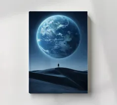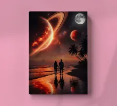 Ein kolossales, verwittertes Herz schwebt gelassen über einer weiten, zerklüfteten Landschaft, ein kraftvolles Symbol für dauerhafte Liebe in einer trostlosen Welt. Zwei kleine Figuren stehen in seiner Gegenwart und verstärken das epische Ausmaß und das filmische Gefühl dieses surrealen Kunstwerks. Mit seinen Vintage-Tönen und seiner zum Nachdenken anregenden Bildsprache ist dieses Werk ein Gesprächsanlass und eine Hommage an die große Reise der Liebe.